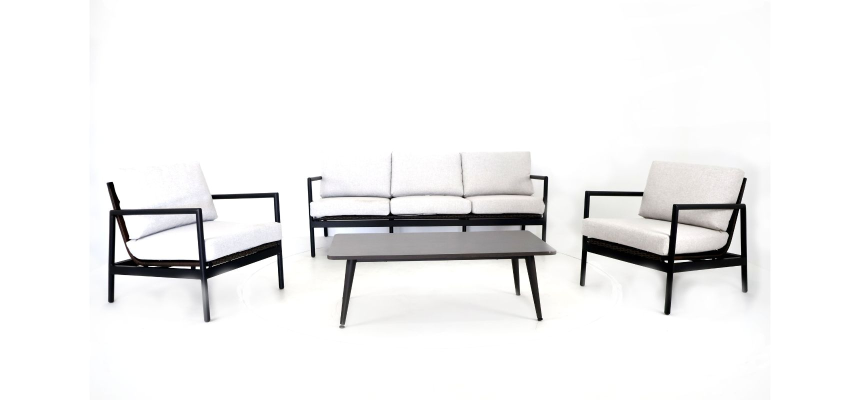Facilmente laváveis com água, as peças necessitam de uma manutenção mínima, peças elegantes de estrutura preta com almofadas cinza claro que são intemporais.