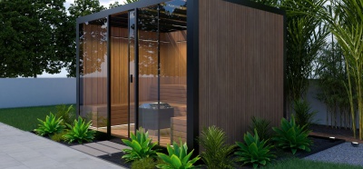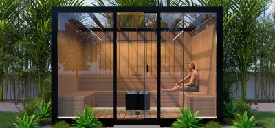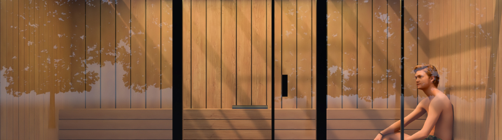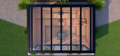 Os materiais premium e o design cuidadoso garantem que ao entrar na Sauna Serena vai sentir-se confortável: um espaço para relaxar. Com perfis em preto, caxilharia também preta e vidro transparente, esta sauna é moderna e elegante.