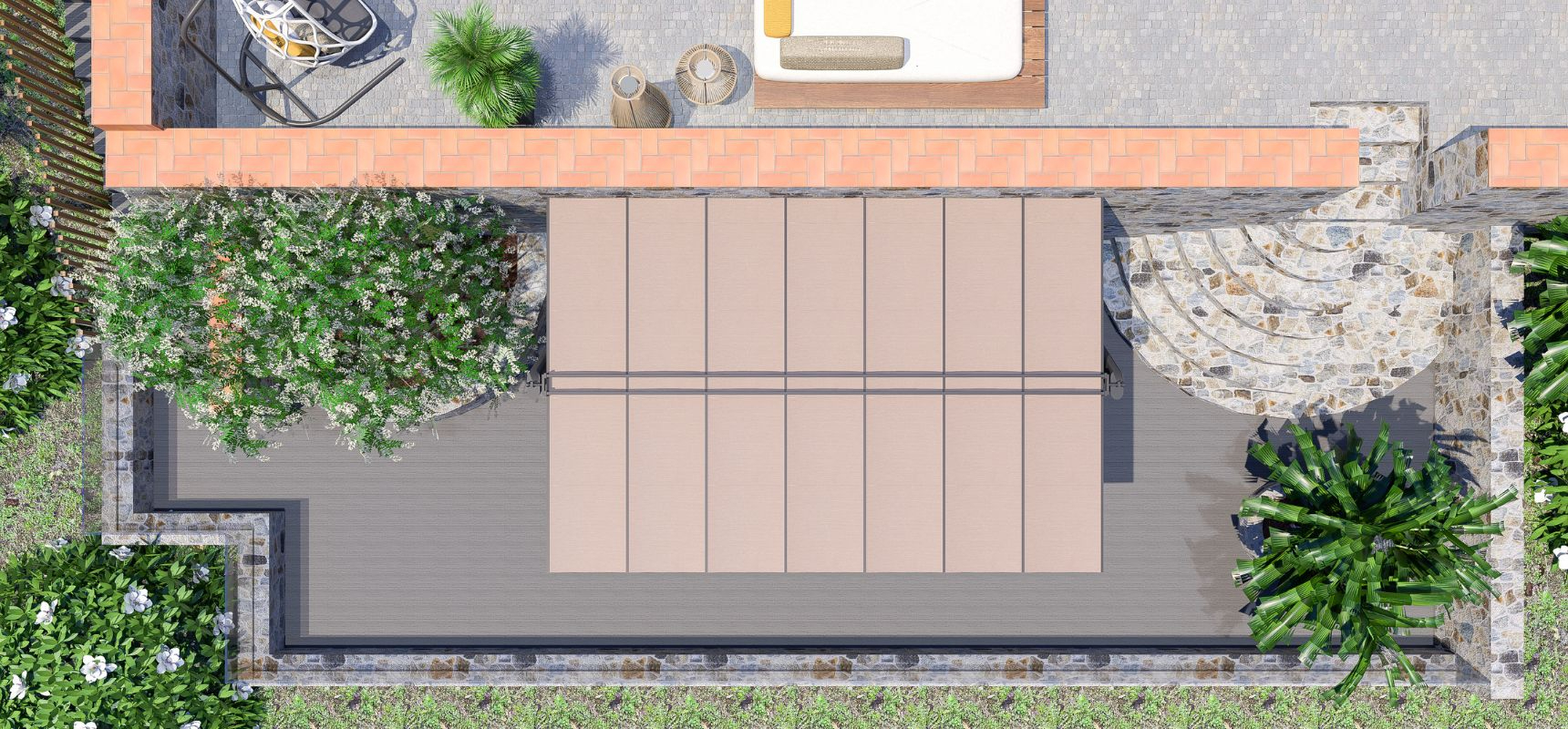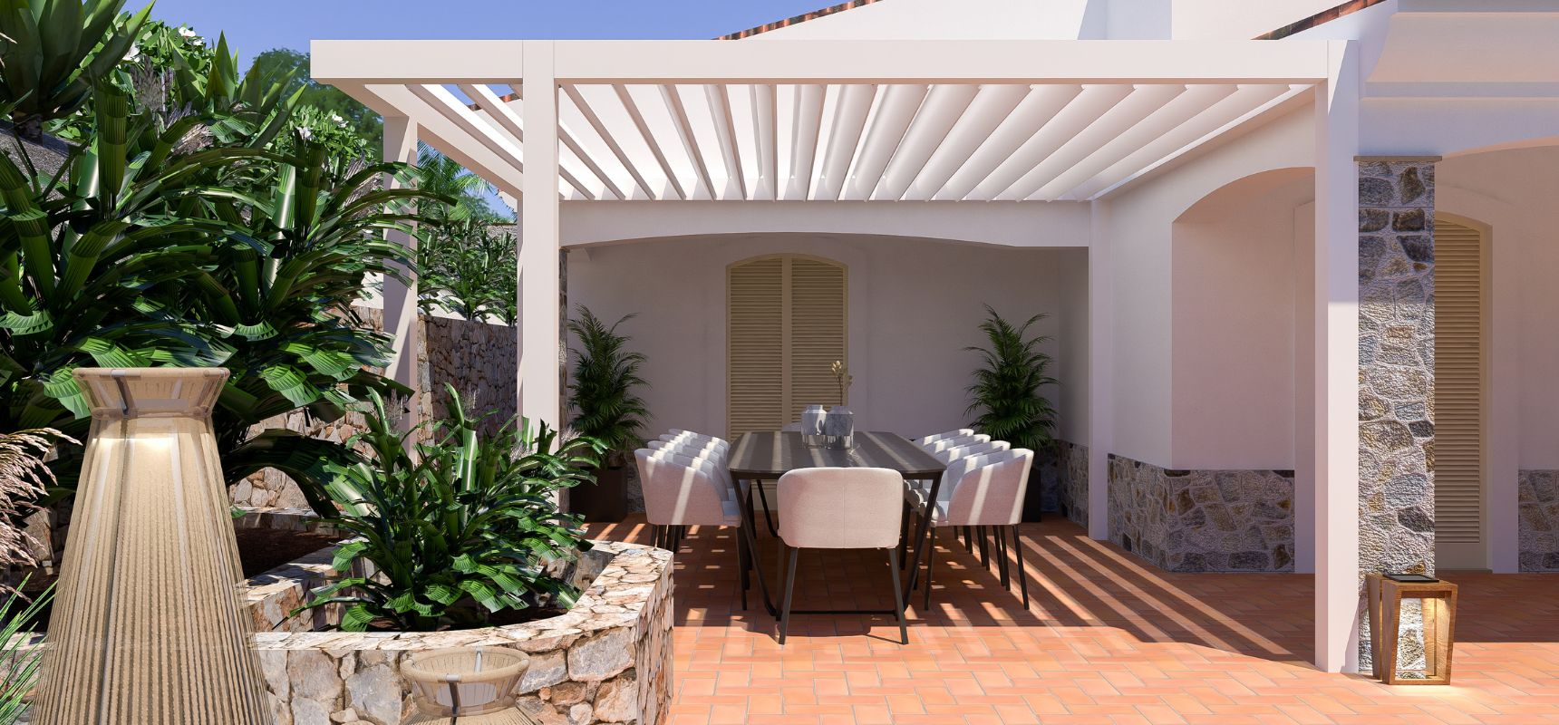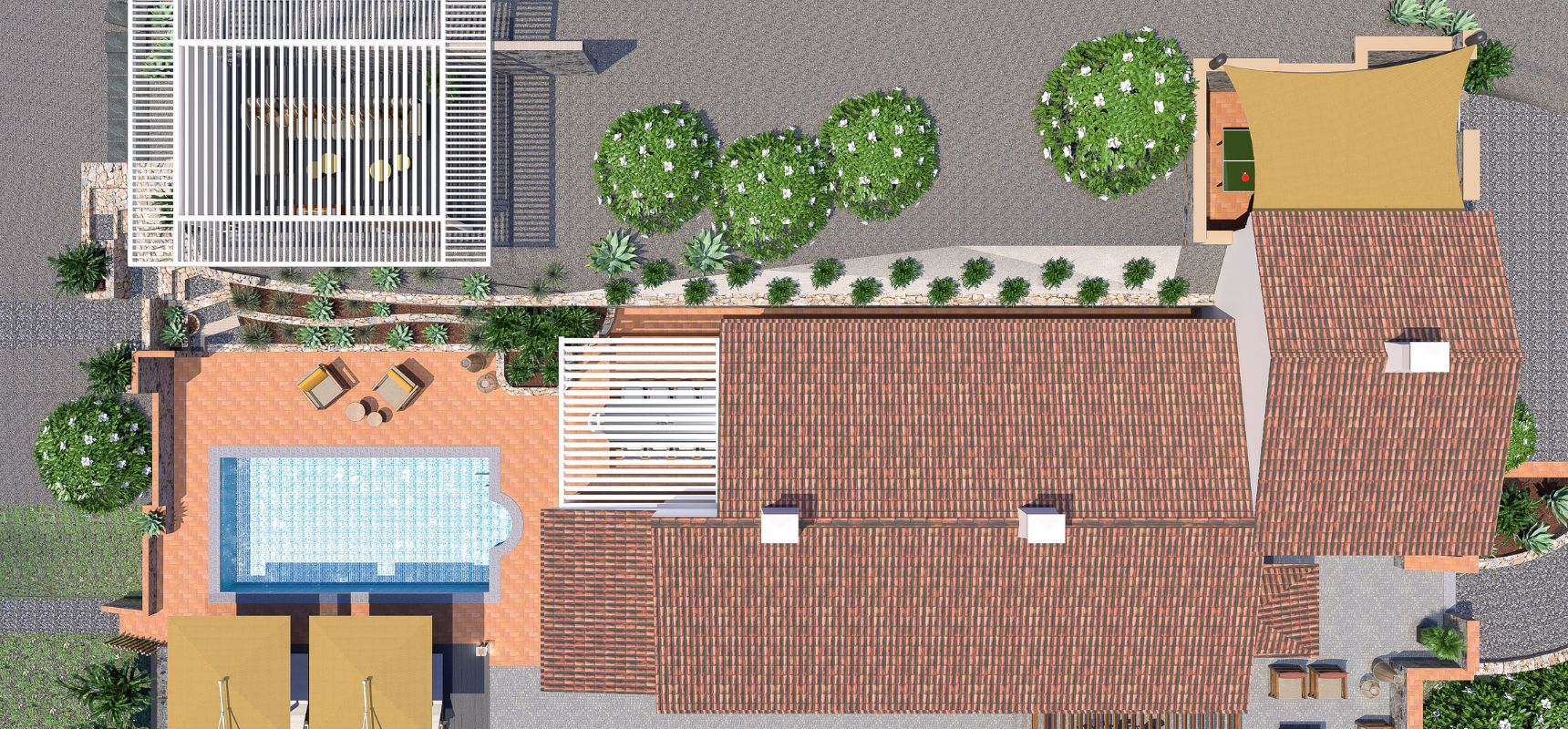 Criámos decks junto à piscina com uma decoração contemporânea, com sombrinhas, toldos, esperguiçadeiras e cadeirões para relaxar, com apontamentos de cor que combinam com a fachada da moradia. Foram criados espaços de refeição com pergolas, assim como uma zona de estar com uma lareira, para os dias mais frios.