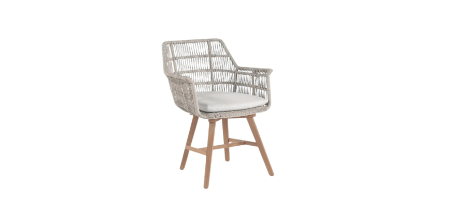 O tecido abacá resiste a rachaduras, descascamento, desbotamento e quebra. Garante a qualidade duradoura, com uma almofada de assento solta para maior conforto, convidanda-o a desfrutar de experiências gastronomicas ao ar livre. Projetadas para combinar facilmente com a coleção Loretta Outdoor, as pernas em madeira de teca natural exibem uma tonalidade inicial castanha que evolui com o tempo. Exposta aos elementos exteriores, a teca passa por uma transformação cativante, para uma distinta pátina cinza prateada, uma marca registrada da teca para exteriores.