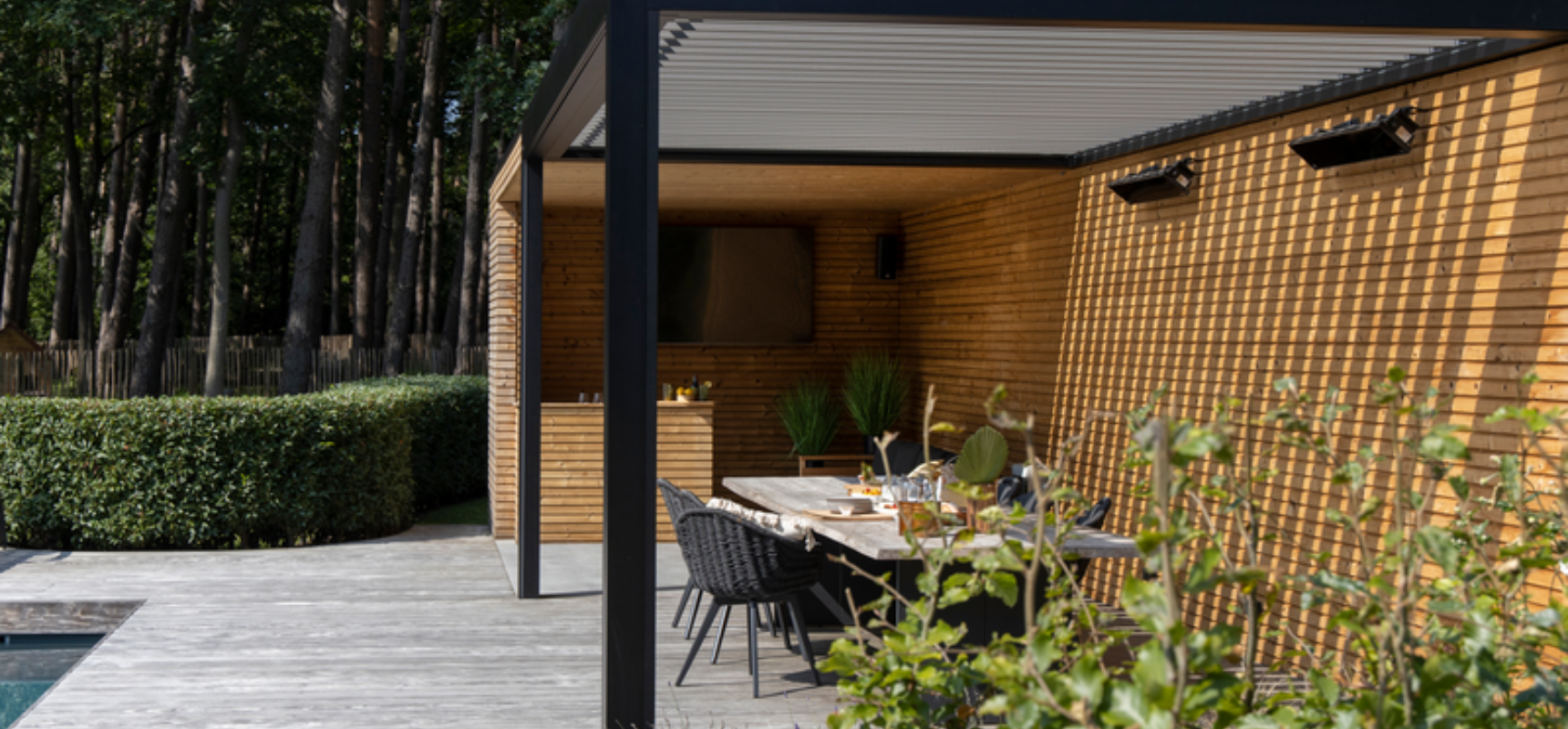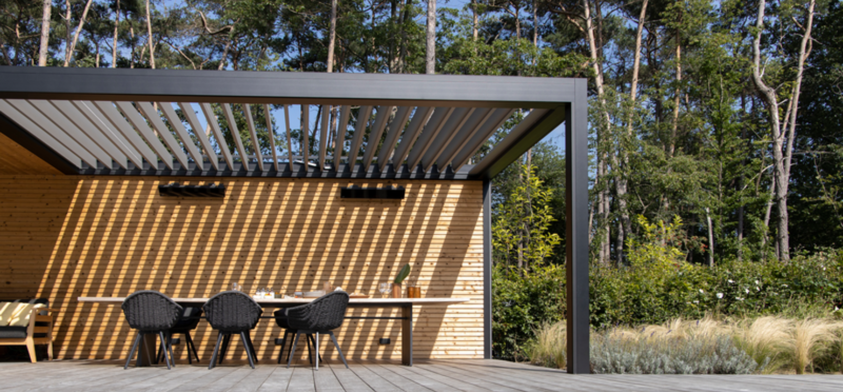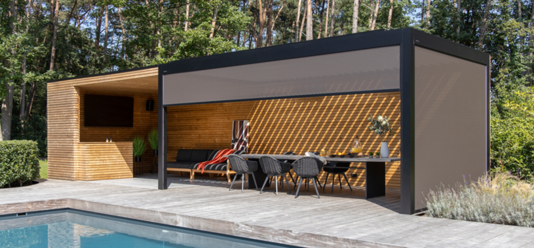 A B250 XL é uma cobertura de pátio da Brustor projetada para ser o mais minimalista possível. Possui venezianas de 21 cm de largura que ficam perfeitamente conectadas à calha, o que garante uma cobertura impermeável e uma bela cobertura plana quando as venezianas estão fechadas. As venezianas são inclináveis, para que possa criar a quantidade perfeita de sombra. O B250 XL possui um controle RTS padrão, para que você possa operá-lo via smartphone ou tablet ou com um assistente de voz como Google Home ou Amazon Alexa. Você também pode escolher um transmissor portátil opcional com controle io. O B250 XL tem inúmeras opções para personalizá-lo, como iluminação, aquecimento, elegantes telas ZIP integradas, alti-falantes Bluetooth e tomadas.