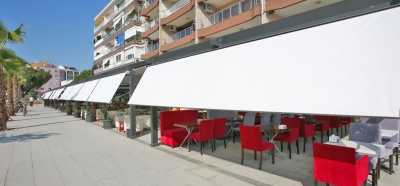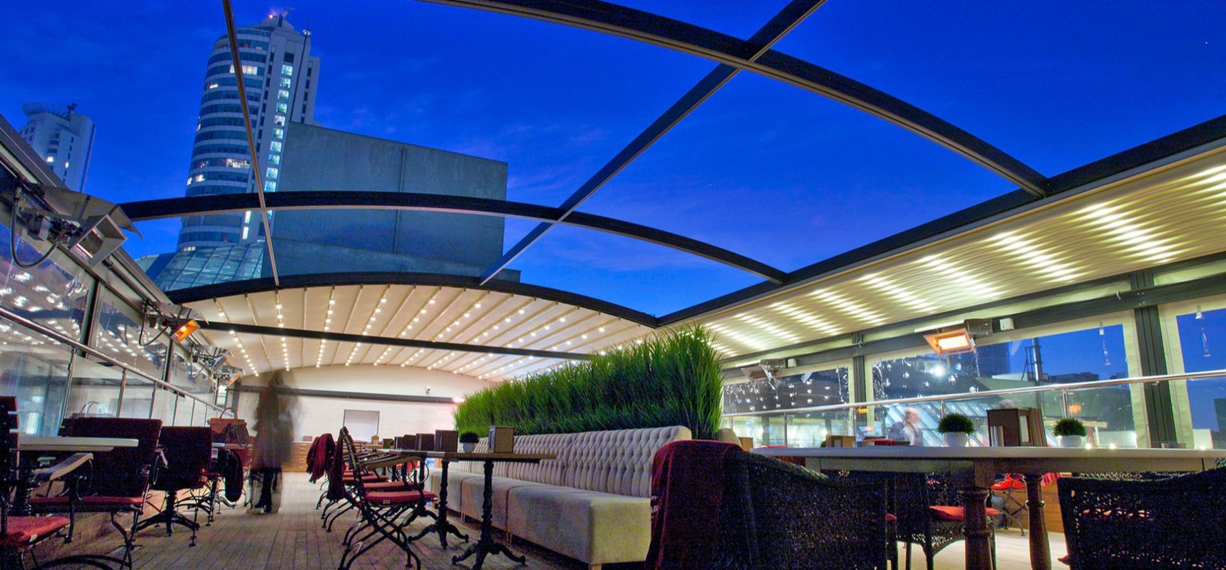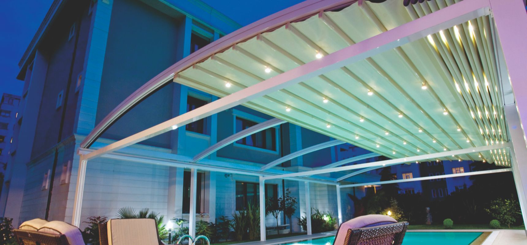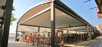 O sistema de pergolas retráteis curvas Luna oferece uma solução avançada para permitir que áreas externas sejam usadas em todas as condições climáticas. O sistema oferece uma classificação de vento até a classe Beaufort 11 (até 117 km/h) e foi projetado para resistir até mesmo às piores condições de chuva, granizo ou sol.