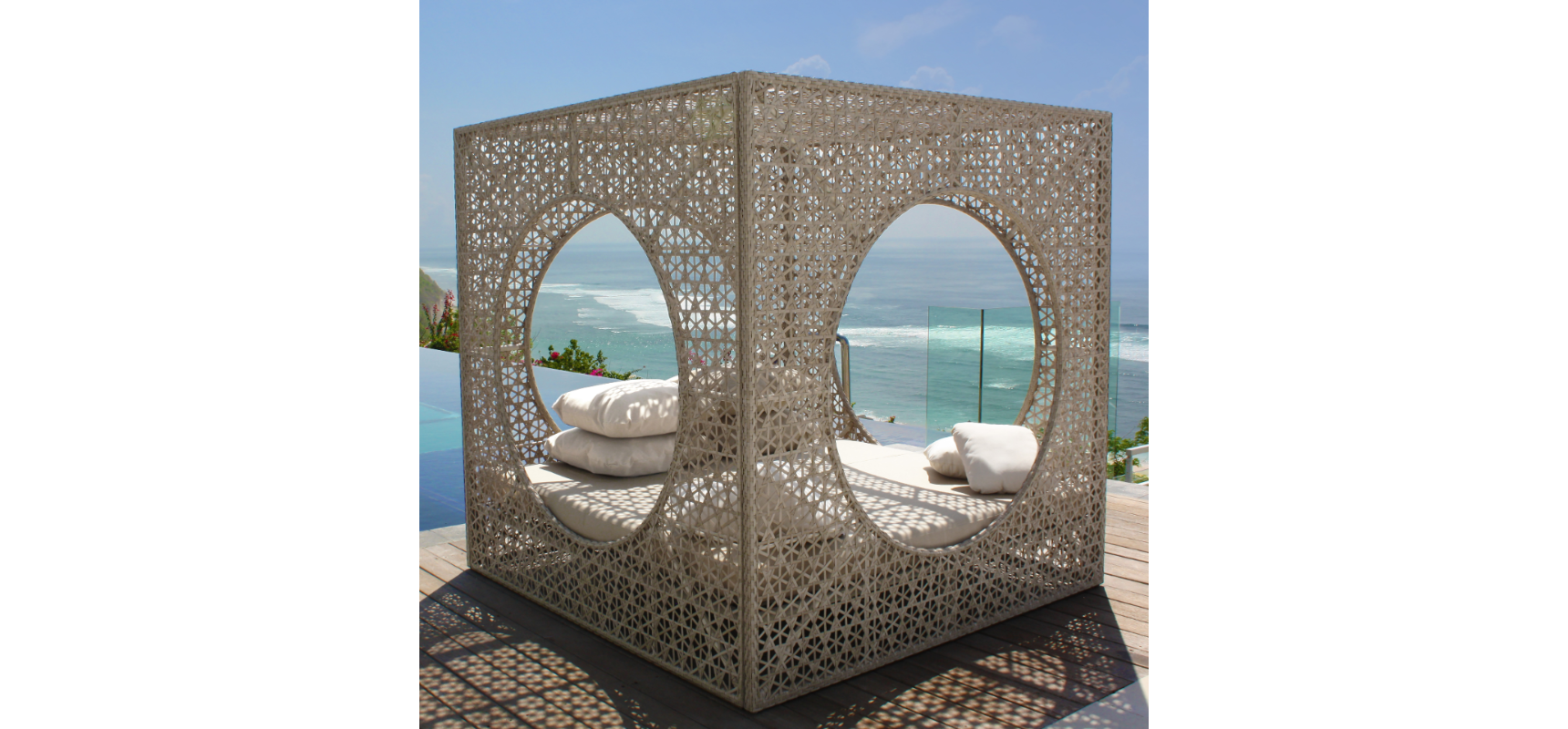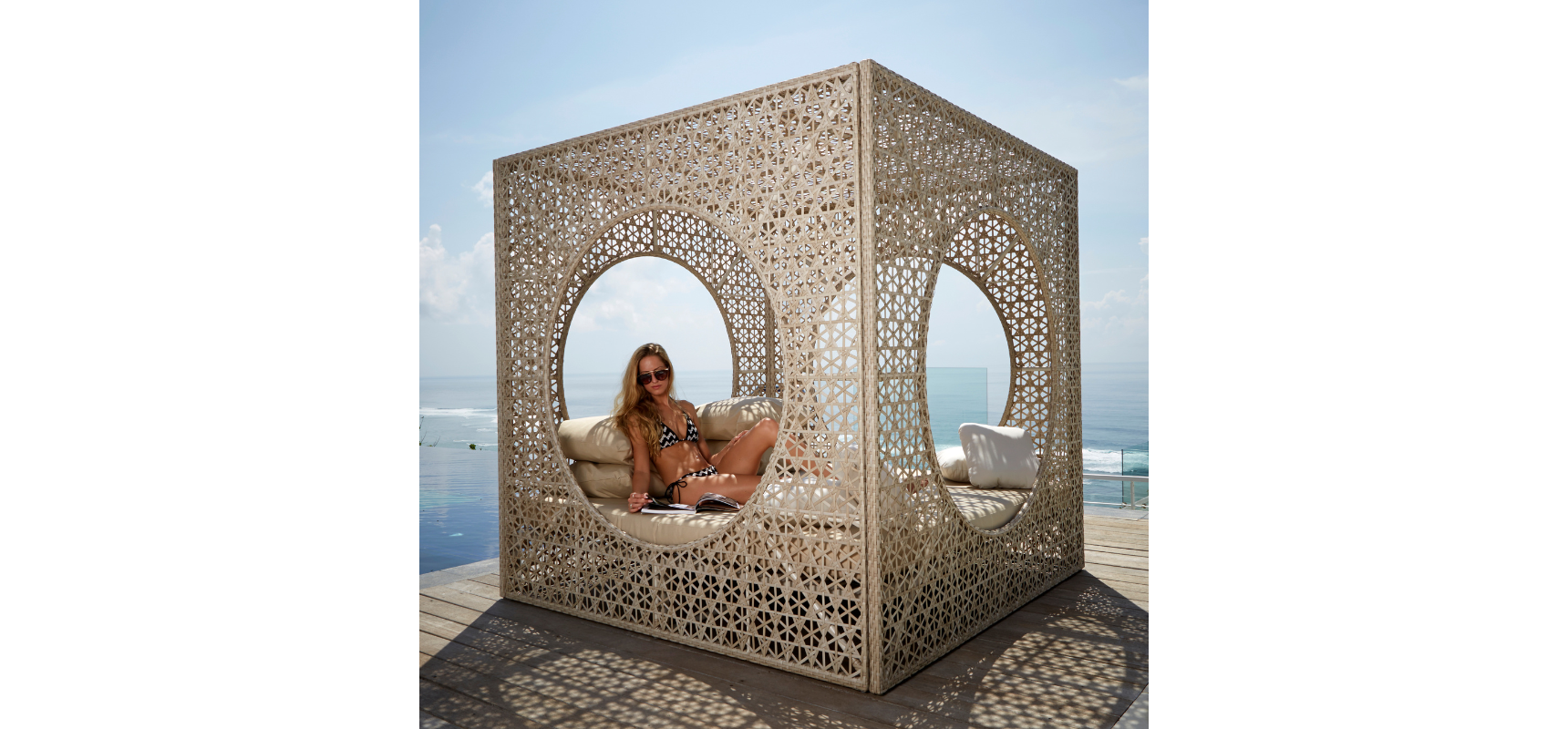 CUBE é uma luxuosa daybed, com charme excepcional e forma geométrica, remetendo à orientalidade, destaca-se pela elegância e exclusividade em qualquer contexto outdoor. Feito com estrutura robusta de alumínio e revestimento externo em polywood, madeira sintética resistente à água e UV.