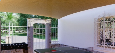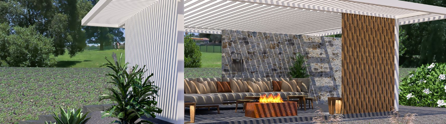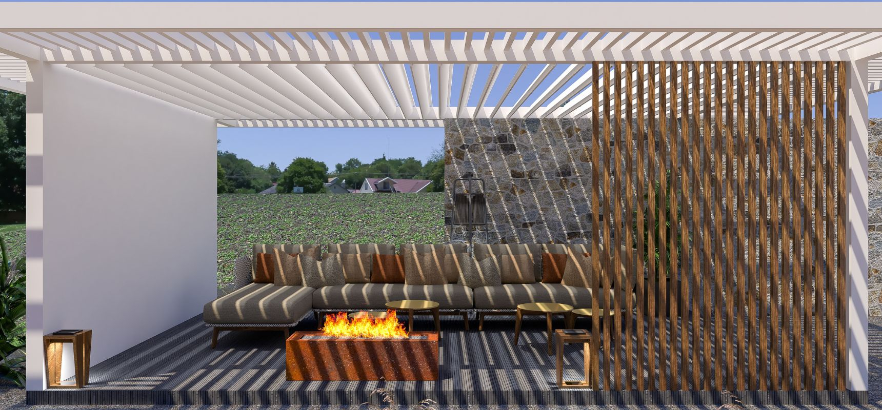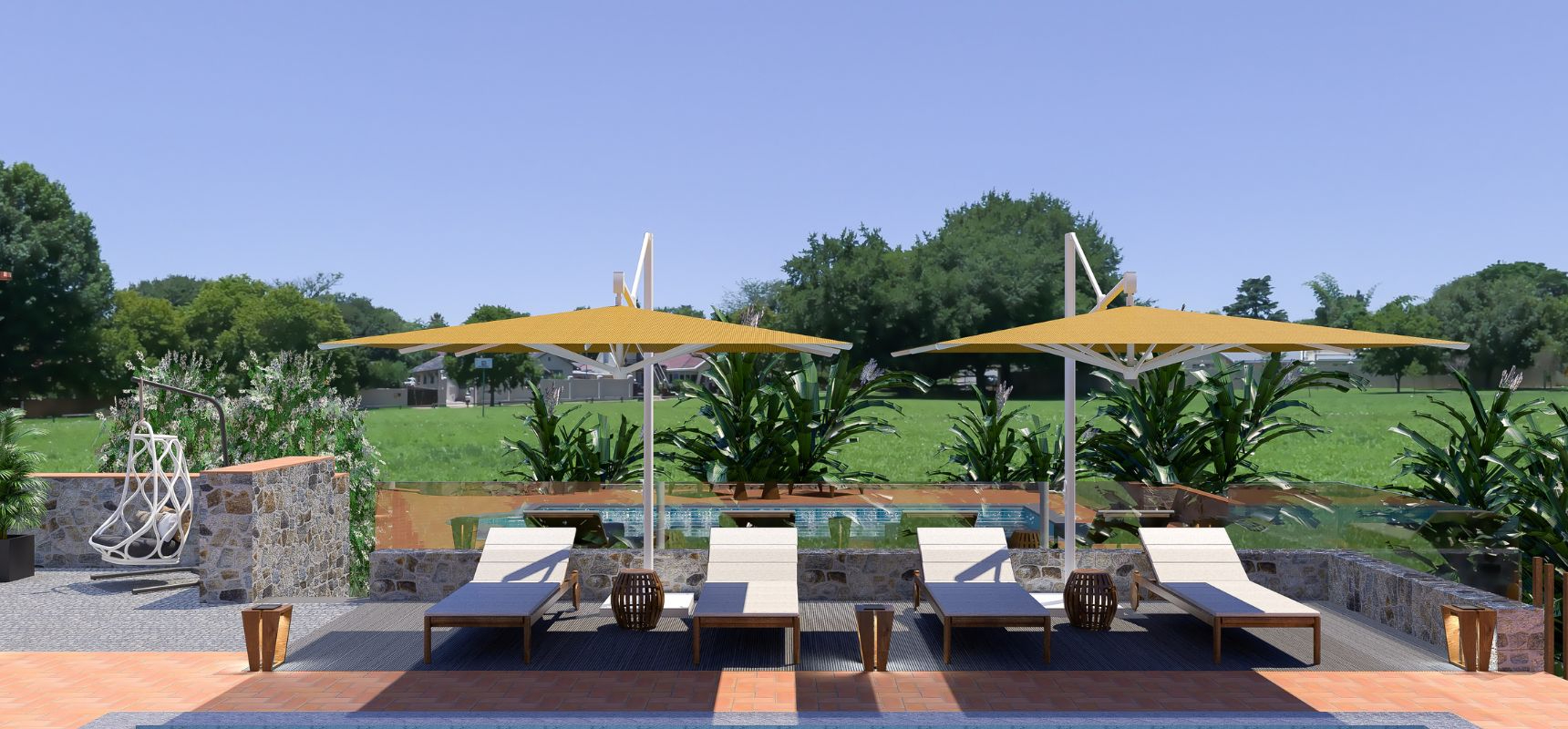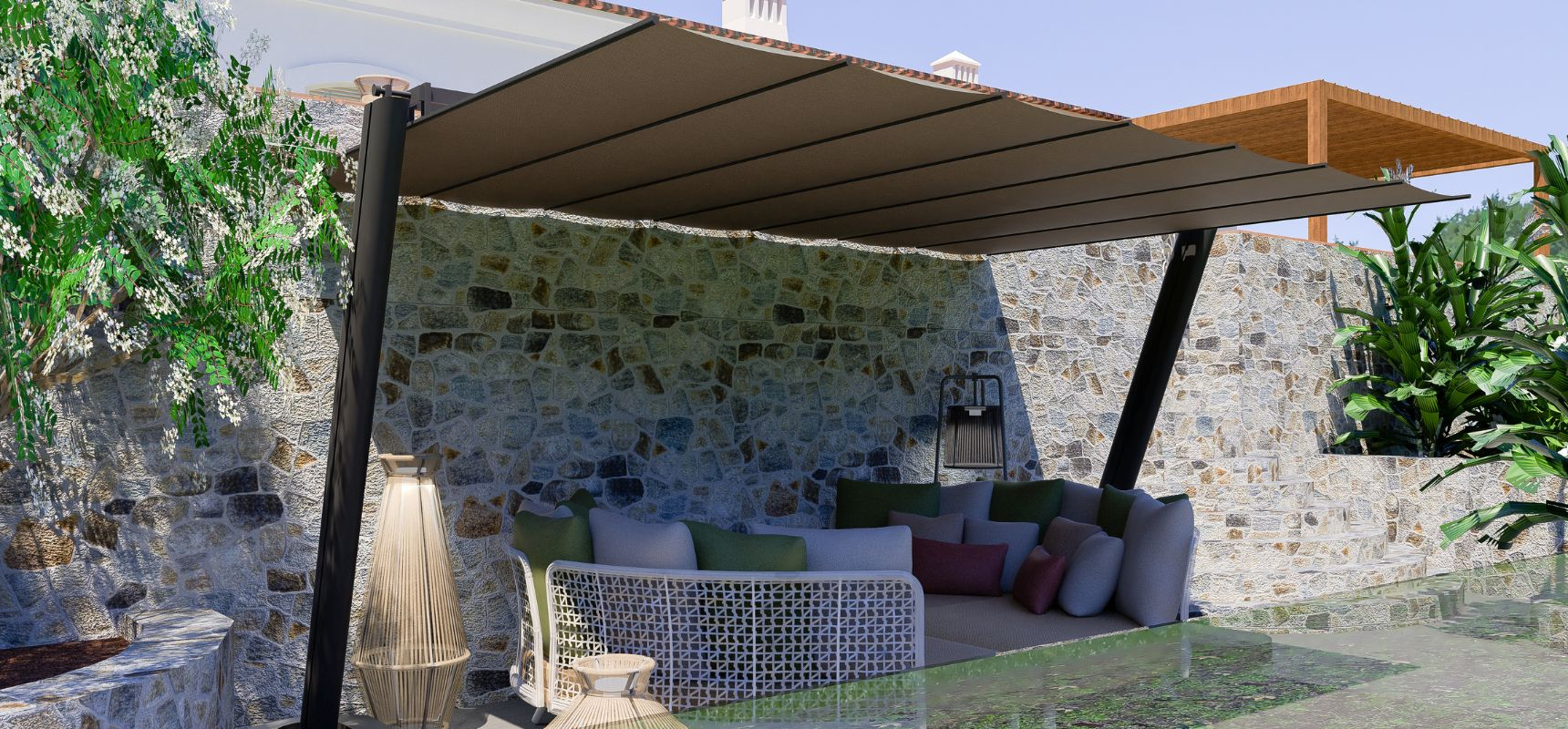 Criámos decks junto à piscina com uma decoração contemporânea, com sombrinhas, toldos, esperguiçadeiras e cadeirões para relaxar, com apontamentos de cor que combinam com a fachada da moradia. Foram criados espaços de refeição com pergolas, assim como uma zona de estar com uma lareira, para os dias mais frios.